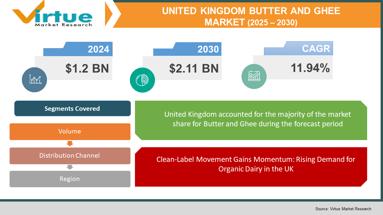 The United Kingdom Butter and Ghee Market was valued at USD 1.2 billion in 2024 and is projected to reach a market size of USD 2.11 billion by the end of 2030. Over the forecast period of 2025-2030, the market is projected to grow at a CAGR of 11.94%.